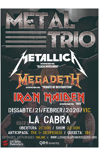 Vente a revivir con nosotros sus temas más cañeros, de la mano de sus mejores bandas tributo: "666" (Iron Maiden), "TRIBUTE OF DESTRUCTION" (Megadeth) y "BLACK HORSEMEN" (Metallica).